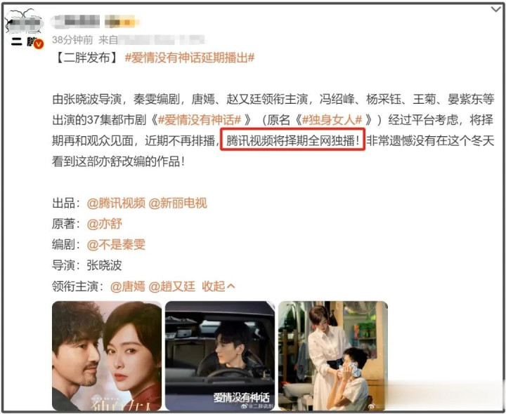 此外,根据知情博主的爆料可以了解到,鹅厂很可能会将《爱情没有神话》择期全网独播。众所周知,央视播剧一向谨慎,会慎重考虑舆论风险,所以,该剧日后想要上星央视恐怕是难上加难了,至于能不能上星其他卫视,还要看出品方之后的对接情况。本来板上钉钉的央八上星大剧,如今因为秦雯的袭警风波上星困难,真是让人唏嘘啊。