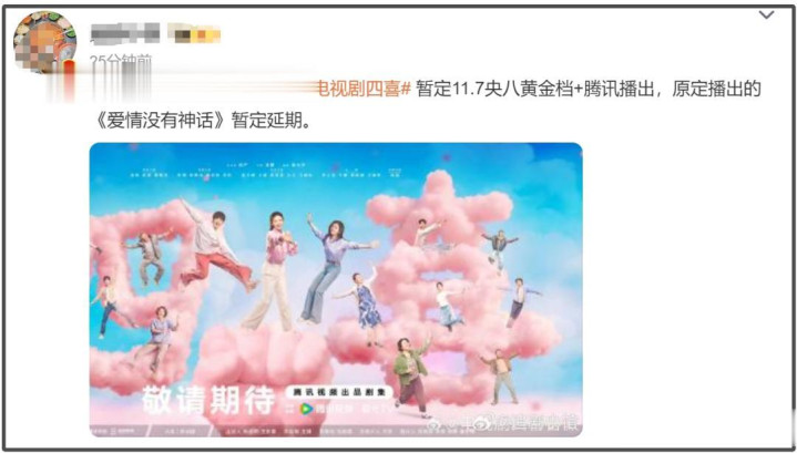 可惜,计划赶不上变化,秦雯袭警风波不断升级,《爱情没有神话》也在预计开播的前四天传来了紧急撤档的消息。业内人士爆料称童瑶和蒋欣主演的电视剧《四喜》“临危受命”,紧急提档,将在11月7日央八黄金档播出,原定播出的《爱情没有神话》则延期了。紧急提档的《四喜》很快进入播前营业节奏,一天之内连发多条短视频为四天后的开播预热。